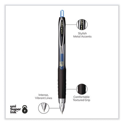 Stock your office, home or classroom with 207 Retractable Gel Pens from uni-ball featuring a 0.38 mm ultra micro point with a stainless steel tip that resists bending and breaking. Even-flowing, pigment-based gel ink delivers a smooth writing experience for intense, vibrant lines, ensuring that every mark is brilliantly communicated. Use these retractable gel pens for everyday writing tasks, check signing and all of your important signatures, trusting its quick-drying uni Super Ink. Innovative uni Super Ink technology effectively entraps the gel ink into the paper, producing fraud, fade and water-resistant documents that resist check washing or bleaching. The 0.38 mm ultra micro point produces neat and precise strokes for intricate writing, making it easy to create super fine details in your drawings and diagrams. A textured grip offers greater comfort and control as you continue writing, while a translucent ink window indicates the level of gel ink remaining, so you don't run out unexpectedly. The sleek design of the 207 with modern metal accents gives the retractable gel pen a stylish touch.