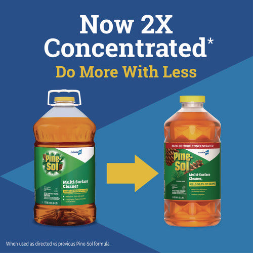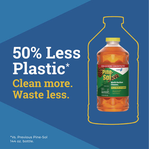 With Pine-Sol® Multi-Surface Cleaner Disinfectant Concentrated from CloroxPro™, you only need one product to fight tough dirt, grease and grime. A 2X concentrated formula delivers more cleaning power per drop than previous Pine-Sol® Pine formula. Easier to handle and easier to store, the space-saving bottle gives you more cleaning solution in a smaller bottle made of 50% less plastic. This multipurpose cleaner cleans, deodorizes and disinfects in one step, killing 99.9% of germs and leaving a classic scent. It cuts through grime and soap scum and is safe for use on wood, tile, stone, glass and more when used as directed on hard nonporous surfaces. Do not use on marble, aluminum, copper or wood that is unfinished, unsealed, unpainted, waxed, oiled or worn.