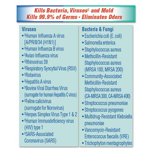 Clorox® Disinfecting Spray kills relevant bacteria, viruses and fungi that can cause serious illness and infection. It is EPA-registered to kill as many as 64 microorganisms and it kills the majority of bacteria on its EPA Master Label in 3 minutes. With incredible versatility, Clorox® Disinfecting Spray can be used on a wide variety of hard surfaces while deodorizing and actually eliminating the bacteria that cause bad odors. From Clorox Commercial Solutions®, this disinfecting spray is ideal for use in offices, day care centers, schools, busy healthcare environments and other commercial facilities.
