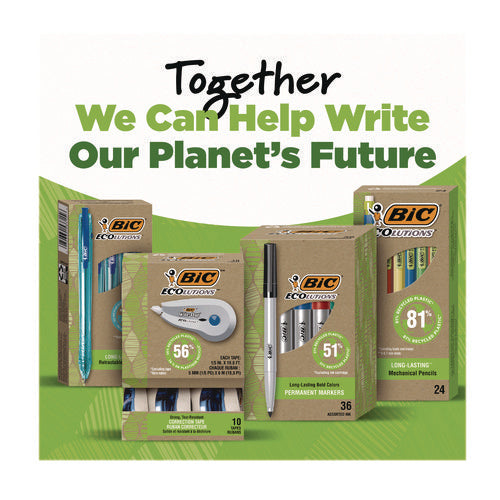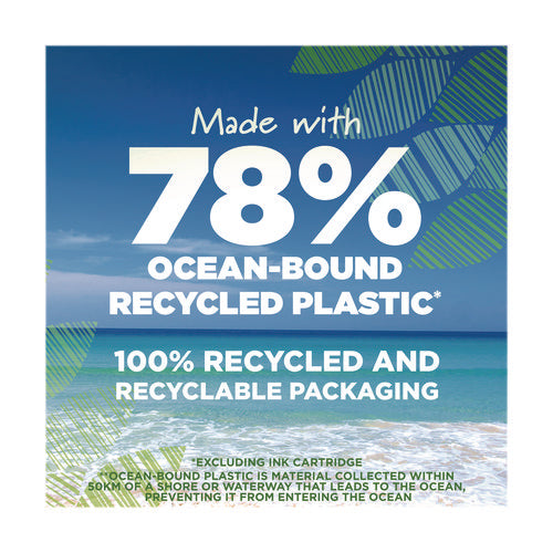 Help write our planet's future with the long-lasting BIC ECOlutions ocean-bound plastic retractable gel pen. This gel pen is made from 78% ocean-bound recycled plastic, excluding the ink cartridge, and the paperboard packaging is made from 100% recycled content and is recyclable. All the materials used are collected within 31 miles of a shore or waterway that leads to the ocean, preventing them from entering the ocean. With a medium 1 mm point, this is the perfect BIC pen for everyday writing. The smooth writing ink system delivers hours of effortless writing. The classic, slender, semi-clear barrel makes it easy to check ink levels. This pen is a smart choice for righties and lefties, as the vibrant ink dries quickly to prevent smearing. Designed for convenience, this retractable pen lets you start writing with just one click. Pick up the BIC ECOlutions ocean-bound plastic retractable gel pen for a high-quality, affordable writing utensil you can trust.