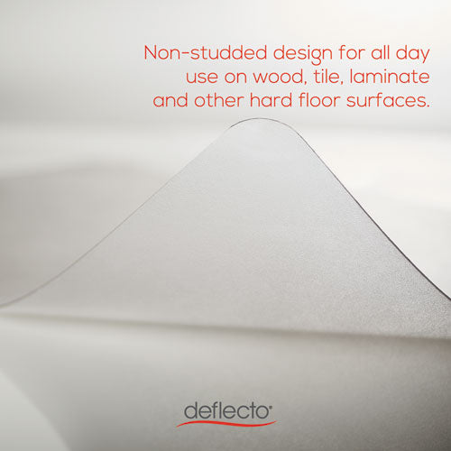Thinner, lightweight, non-studded EconoMat® for hard floors is an excellent value for anyone looking for an all-day use office chair mat to protect wood, tile, laminate and other hard floor surfaces. Easy-glide rolling surface provides smooth office chair movement to help minimize stress and strain on users back, legs and feet, and protects floors from caster wear, spills and heavy traffic. Free and Clear® non-orthophthalate, non-cadmium formula promotes a healthy work environment and delivers exceptional clarity without harsh chemicals.