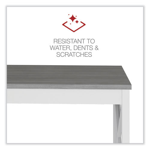 Stylish farmhouse desk with X accents on side panels fits into the décor of most spaces. The multi-function desk is constructed with a smooth, laminate wood top with white wood legs. The simple design without drawers can be used as a desk or console table. The wide top surface provides ample space to work or to display decorative items. Thoughtfully finished on all sides for position flexibility within a room. Some assembly is required.
