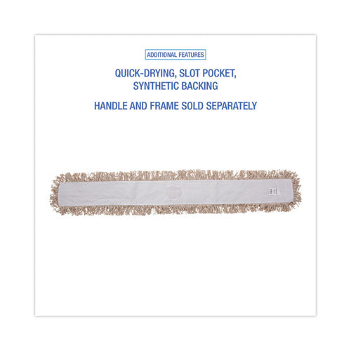 Ten-ply, Hygrade white cotton, cut-end design enhances durability while minimizing snags. Quick-drying, absorbent, slot pocket style with synthetic backing. Used for attaching a mop handle and dusting floors. Works with spray or liquid dust mop treatment and other solutions used to dust floors and add shine. Great for general purpose cleaning and wiping floor surfaces of various materials. Mop handle and dust mop frame are sold separately.