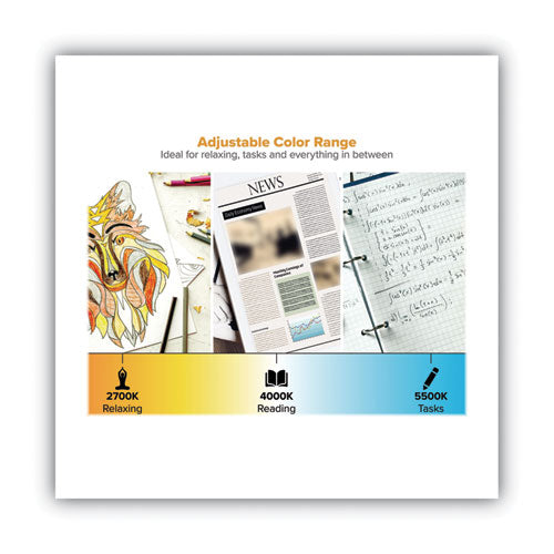 For your desk or on the go, the Bostitch® Konnect™ Compact Foldable LED Desk Lamp is battery-operated and USB-rechargeable. LED light bulb delivers energy-efficient, high-quality illumination that's flicker-, shadow-, halo- and glare-free, and three user-adjustable color-temperature modes allow you to tailor your light-zone to any task or setting. Featuring a sleek design that brings a modern touch to any environment, the shade features a 180° pivot point that allows you to focus your illumination or fold up the light to pocket-size, for easy portability. Match it up with various items in the Konnect™ product line to create the ultimate desktop combination.Package Includes: (1) 4 W LED Bulb; (1) USB Charging Cord