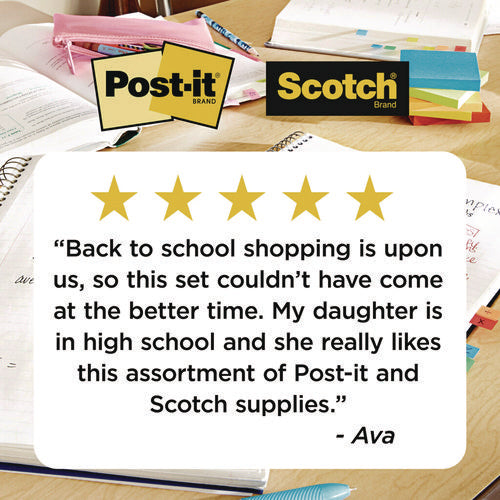 Make sure you have the basics close at hand to crush any work or personal organization challenge that might come your way. This bundle comes with Post-it® Super Sticky Notes, Scotch® Brand Tape, Post-it® Flags and Scotch™ Precision Scissors for a complete kit to write down great ideas, find information fast and prepare to handle fixes on-the-go. The perfect essentials pack. Great gift of back-to-school supplies for teachers. Post-it® Super Sticky Notes have two times the sticking power to make sure notes sticks. Scotch® Brand Tape is ideal to have on hand for creating poster board projects, and labeling on surfaces like plastic, cardboard and metal. Includes one pack of four Post-it® Super Sticky Note pads 3" x 3", one pack of three Post-it® Super Sticky Note pads, 4" x 6" lined, in the Supernova Neon colors, pack of 60 Post-it® Flags, assorted colors, 0.94" wide, one roll Scotch® Magic™ Tape, 0.75" x 650", one roll Scotch® Super-Hold Tape, 0.75" x 650" and one Scotch™ 8" Multi-Purpose Scissors.Package Includes: (4) 3" x 3" Post-it® Super Sticky Note Pads; (3) 4" x 6" Lined Post-it® Super Sticky Note Pads in Supernova Neon Colors; (1) 60/Pack 0.94" Wide Post-it® Flags in Assorted Colors; (1) 0.75" x 650" Roll Scotch® Magic™ Tape; (1) 0.75" x 650" Roll Scotch® Super-Hold Tape; (1) Scotch™ 8" Multi-Purpose Scissors
