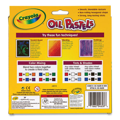 Smooth, creamy laydown of bright, vivid, opaque color that blends to a true secondary color. Jumbo-sized stick designed for children—longer lasting, strong, durable and hexagonal so it doesn't roll off desks. Tapered point is ideal for detail drawing. Each oil pastel has color name on the label.