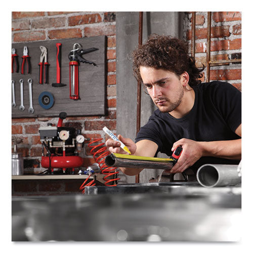 Create permanent and accurate marks on virtually any surface with uni Paint oil-based paint markers from uni-ball. These markers deliver strong and clearly visible lines. Quick-drying paint is water, fade, heat and abrasion resistant. Valve action control provides excellent flow and coverage, while also preventing the marker from drying out if left uncapped. Permanent paint colors mark opaque and glossy on both light and dark surfaces, no matter what it is applied to. The metal barrel and durable tip ensures a long marking life. Ideal for manufacturing, construction sites, automotive, metal fabrication, aviation, marking oily, greasy items and identifying parts or equipment outside.