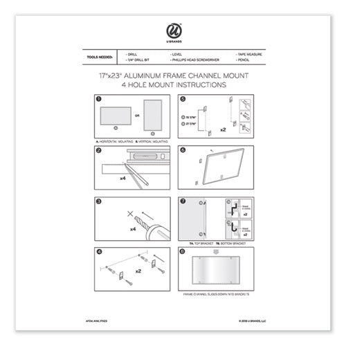 Black aluminum PINIT frame magnetic dry erase board is a perfect and functional solution for the frequent usage areas of your office, school classroom, home or any commercial space. Although all dry erase markers work well with this board, the U Brands dry erase markers provide the ultimate writing and eras-ability experience. Magnetic painted steel writing surface will require minimal ongoing cleaning care to ensure the best performance and resist ink staining and ghosting. Simply use any dry erase board spray or wet dry erase board wipes after continuous use to clean the writing surface. Magnetic writing surface functions as a bulletin board as well; simply use any board magnets to pin all of your notes, messages, pictures, memos, calendars, menus, reminders and more. You may also attach all U Brands magnetic board markers and accessories (sold separately) to the board surface without using the marker tray. Strong and thick insulation underneath the dry erase surface, combined with the aluminum frame provides a firm and rigid construction. Whiteboard has a universal mounting system, as it can be hung vertically or horizontally to fit your allocated space.Package Includes: Mounting Hardware; Instructions