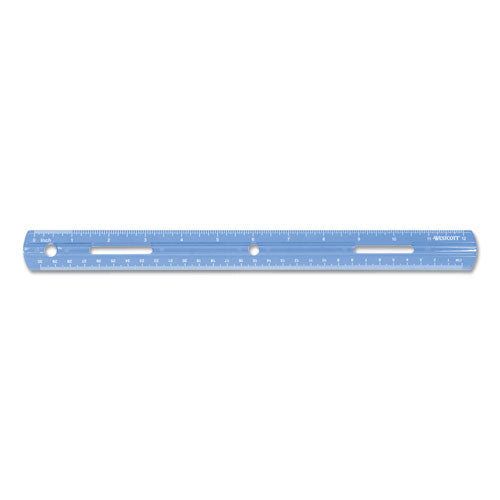 Value-priced, durable plastic ruler is ideal for students. Raised, bold standard and metric markings simplify measurement tasks. Beveled edge acts as an excellent drawing and drafting guide. Convenient two- and three-ring binder slots enable easy storage.