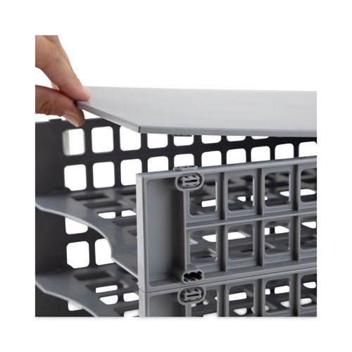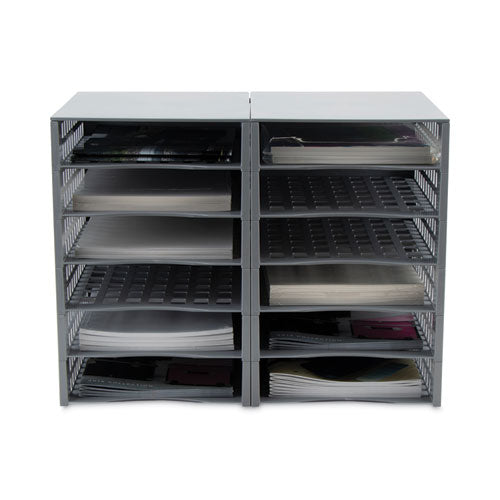 The ultimate paper tray organizer system for paper, notebooks, magazines, craft paper, notes, binders, and more. The Thinkspace Configurable Paper Tray System includes a set of 12 paper trays and 3 lids to customize and fit into any space necessary. Easily snap together trays horizontally or vertically in any combination to suit any space. Store on desktops, countertops, or shelves to maximize space to organize a workspace, home office, or classroom. The minimalist gray tray system is perfect for any professional office.
