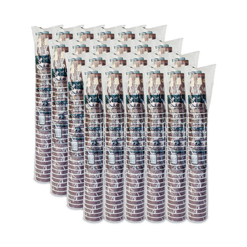 Enjoy your drink without inconvenience—insulated, double wall paper cups eliminate the need for a cardboard sleeve. Insulating air channels reduce heat transfer, keeping the sidewall cool to the touch. The upscale coffee-themed design is perfect for any cafe or restaurant. Thermotouch insulation maintains beverage temperature. Convenient, leak-proof corresponding lids, for drinking on the go (sold separately). Four cup sizes share one lid.