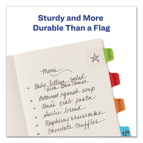 Sturdy, self-adhesive repositionable tabs that make indexing, marking, referencing and separating documents quick and easy. Writable on both sides of the tab, and the adhesive body is clear so you can see text underneath. Durable enough to turn pages like a divider, and they stick securely but remove cleanly with no residue. Ideal to use for organizing and marking key information in notebooks, files, books, planners and more. Perfect for home, office and school.