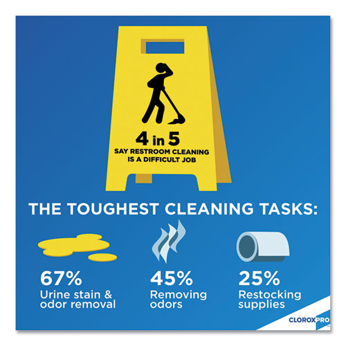 Clorox® Urine Remover for Stains and Odors tackles the toughest urine stains and odors. With the cleaning power of hydrogen peroxide, it quickly breaks down urine to eliminate odors and remove stains. This versatile cleaner is safe to use on most hard and soft surfaces. It is specially formulated for tough-to-clean porous surfaces, like grout, notorious for trapping urine odors. It also handles stains and odors on soft, absorbent surfaces like carpet and mattresses. This urine remover is also great for outdoor concrete, walls and flooring, laundry pre-treatment, pet stains, and bodily fluids removal including feces, blood, and vomit. Ideal for offices, day care centers, schools, hotels, restaurants and other commercial facilities.