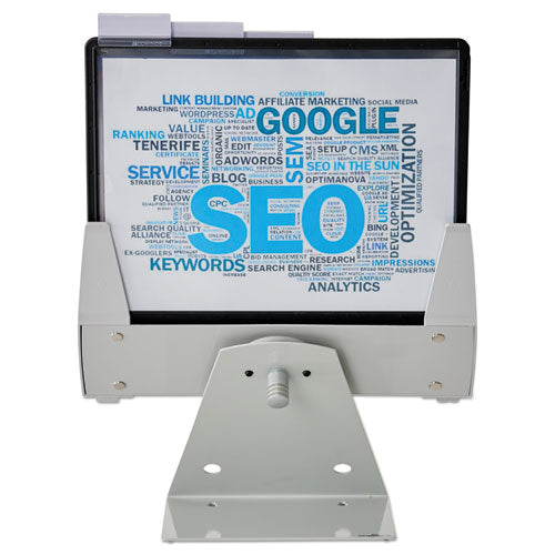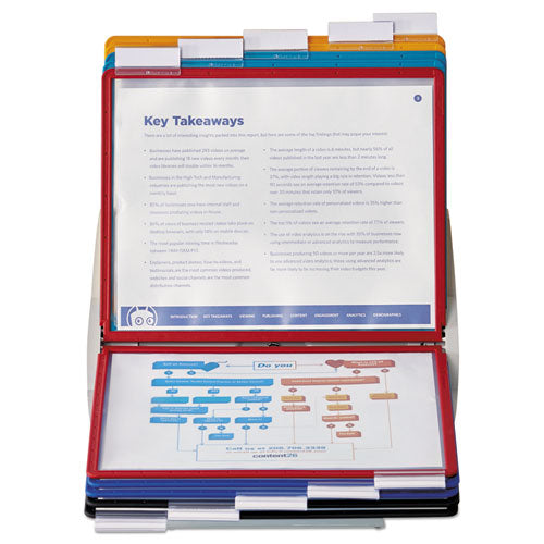 Unique rotating dual wall and desk system. Patented rotating mechanism to effortlessly change from portrait to landscape use. Glare-free, polypropylene sleeves with rugged frames. Not expandable. Frames come in assorted colors (2 ea red, black, dark blue, green, yellow). Includes desk stand/wall adapter, 10 sleeves and 10 snap-on tabs.Package Includes: Desk Stand/Wall Adapter; (10) Sleeves; (10) Snap-On Tabs (Top/Side Mount)